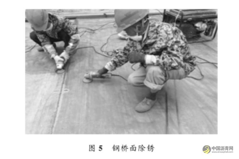 钢桥面整体大面可采用喷砂或抛丸的方法机械除锈,除锈后的钢板表面清洁度应达到Sa2.5级,粗糙度应达到40~80μm。不适于喷砂或抛丸的少数部位可以使用机械打磨除锈,除锈后的钢板表面清洁度应达到ST3级。除锈工作如图5所示。
