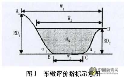 侯相深[47]从车辆行驶的安全性角度出发,提出采用车辙最大深度(RD1)、车辙宽度(WI、W2、W3)、车辙最大可能积水面积(Aw)、车辙槽的平均曲率半径(p)等多个指标来表征车辙的状况,见图1。进而对其作出多指标的评价,但其并没有给出一个综合评价指标和评价标准。