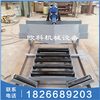 单双侧耐磨式犁式卸料器,是以电液推杆为动力源,工作时通过推杆伸出驱动杆,带动框架前进完成头下落,并支撑起平托辊组,使胶带工作面平直,机头下沿与胶带面贴合紧密,将胶带上物料写入斗中,送到要场所,卸料完毕后,启动电液推杆而缩回驱动杆,带动框架后退,犁头上抬,可变托辊组由平行变回槽形,让物料平稳通过。