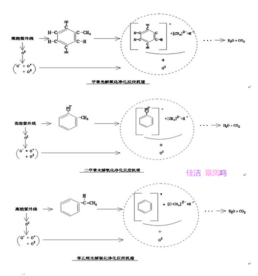 研究表明:活性自由基•OH 的氧化电位(2.8eV)比氧化性j强的臭氧的氧化电位(2.07eV)还高出35%。•OH 自由基与有机物的反应速度高出几个数量级。而且•OH自由基对氧化污染物的反应是无选择性的,可引发链式反应,直接将污染空气中的大部分有h物质氧化为二氧化碳和水或矿物质。其作用机理如下: